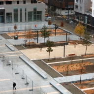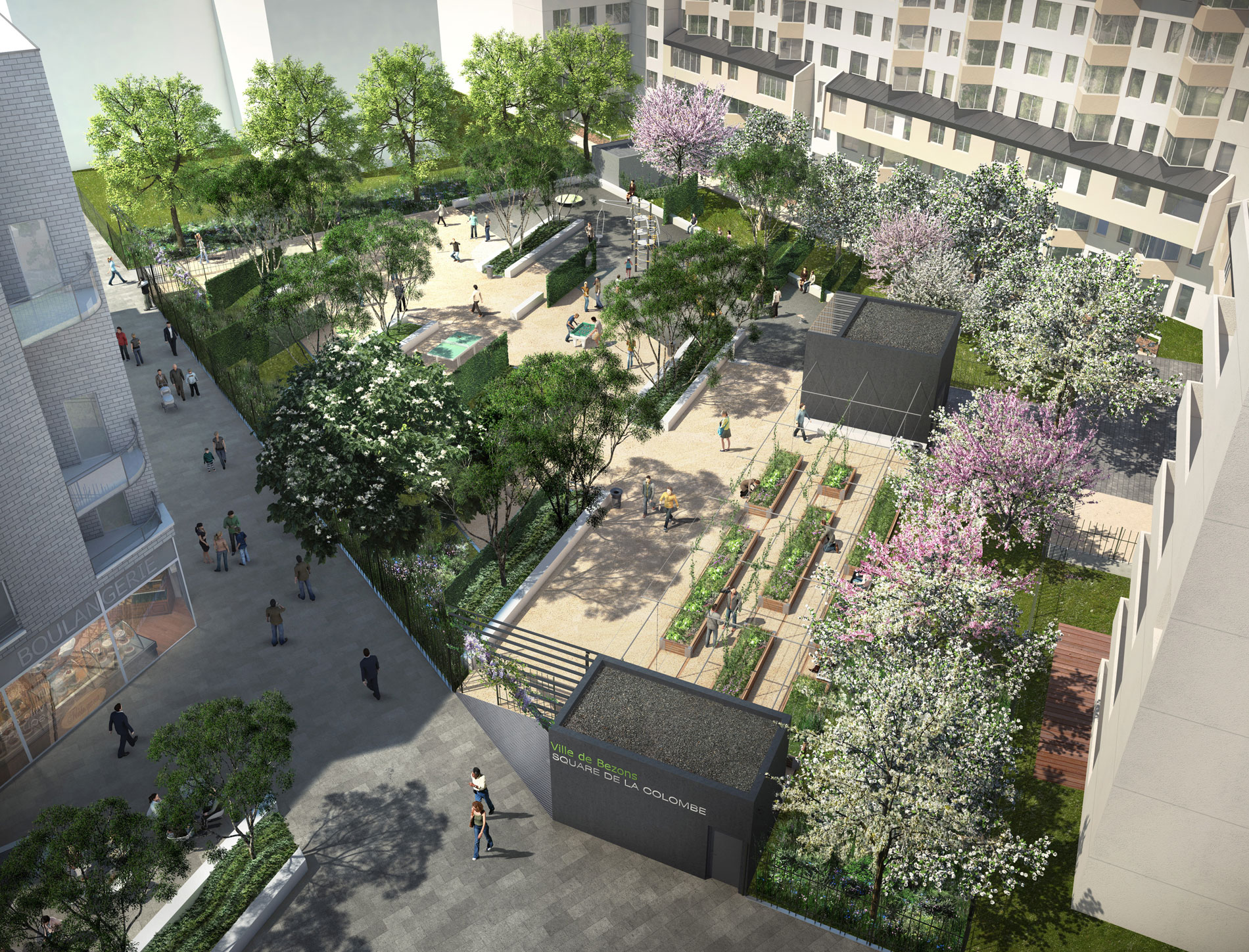 Le square du Colombier prend place au cœur d’un îlot remanié, sur l’emprise d’un parc de stationnement souterrain. Il s’adosse à des ensembles de logements existants et projetés, et intègre les édicules de sortie du parc de stationnement.