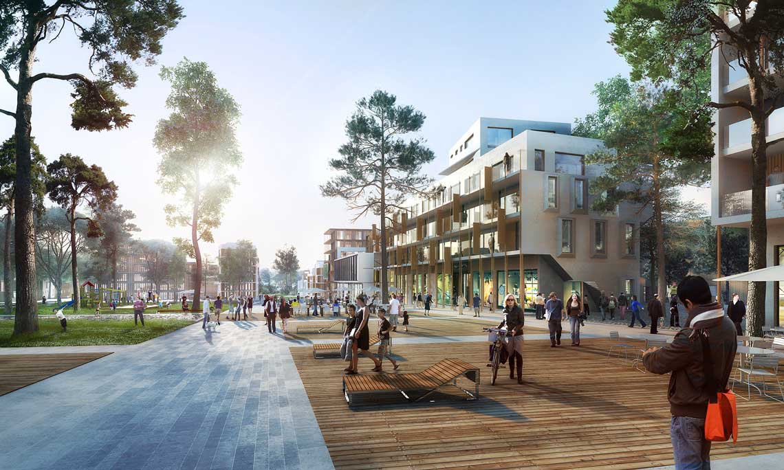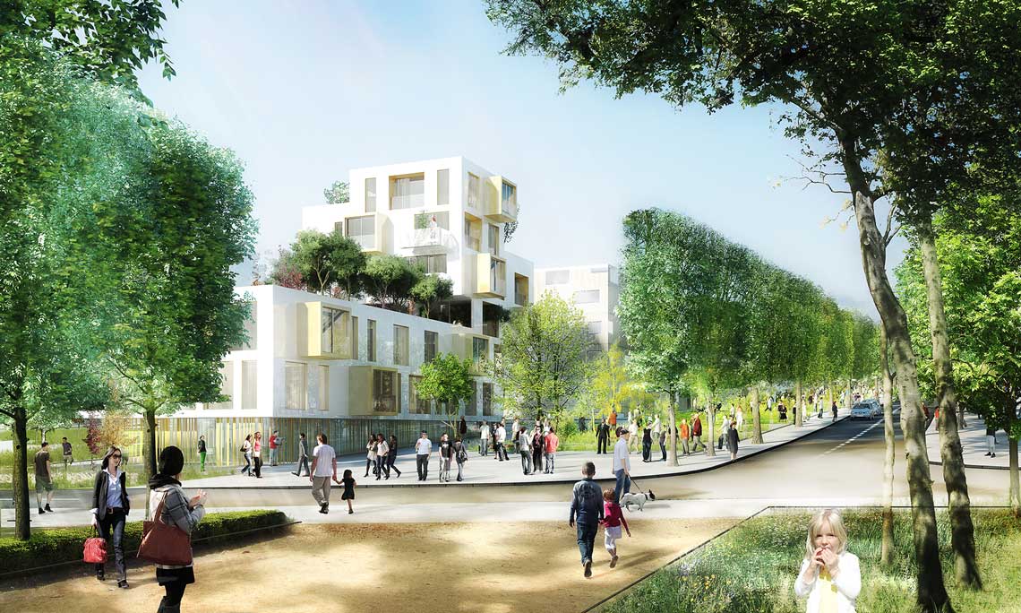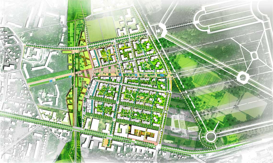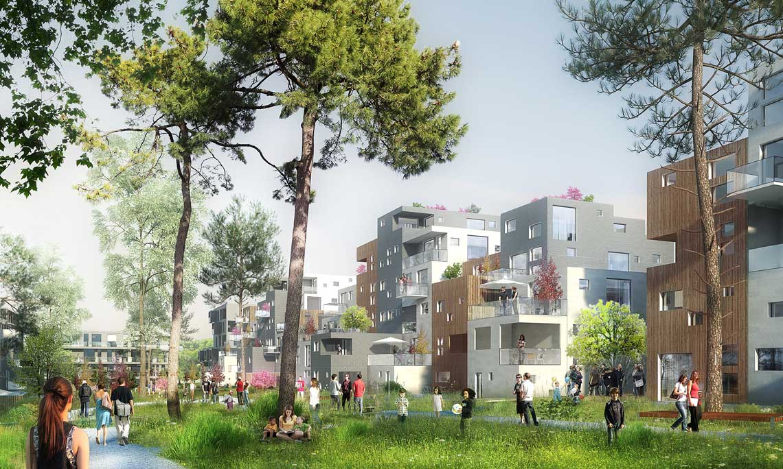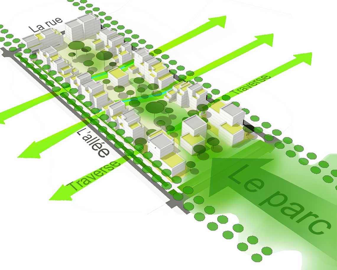 Le projet tisse des liens nouveaux selon les trames du parc et celles de la ville, il résout les contraintes fortes de topographie et réconcilie la rivière avec le grand paysage. Rencontre de la Ville et du paysage, la « Ville Parc 2.0 » est tournée vers l’avenir, la programmation ambitionne un quartier résolument urbain, intense, actif et durable dans lequel l’habitant est placé au centre des réflexions. La mixité est assurée tant par les fonctions ; logement, tertiaire, commerces, activités, culturel, loisir, que par les typologies bâties proposées, du grand collectif à la maison de ville.