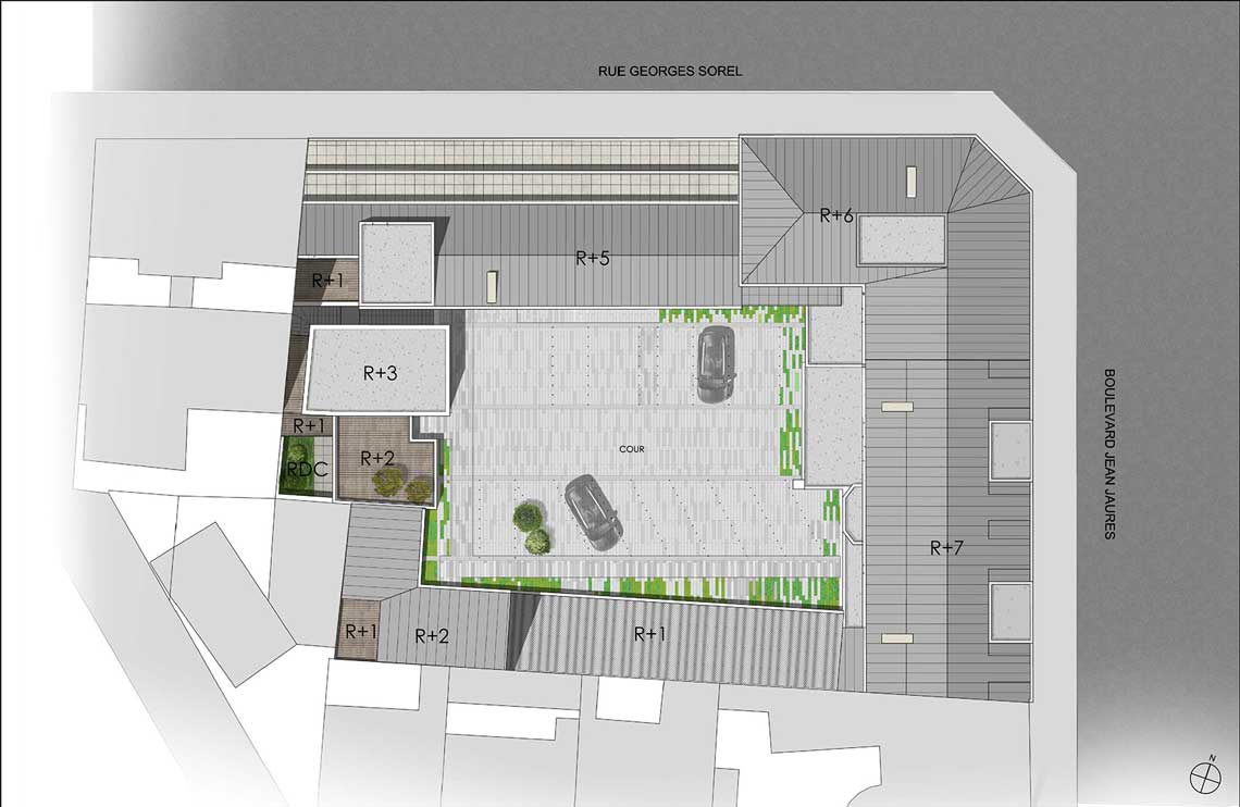Concernant la construction neuve, une brèche est créée entre ce nouveau bâti et celui sur rue, permettant la pénétration de la lumière et donnant accès aux nouveaux logements en partie haute.