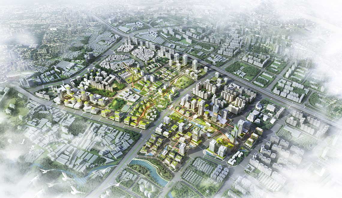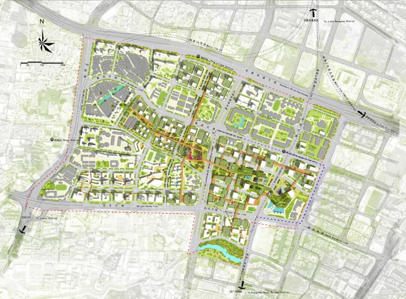Notre conception urbaine poursuit organiquement le statu quo de la texture des rues, des grands arbres et des bases de montagne dans l’espace, créant un squelette d’espace perméable avec une mémoire régionale. Le projet a superposé 5 concepts de conception et a finalement formé une structure spatiale d’ « un axe traversal, trois coeurs, six pièces, couloirs multiples et noeuds multiples ».