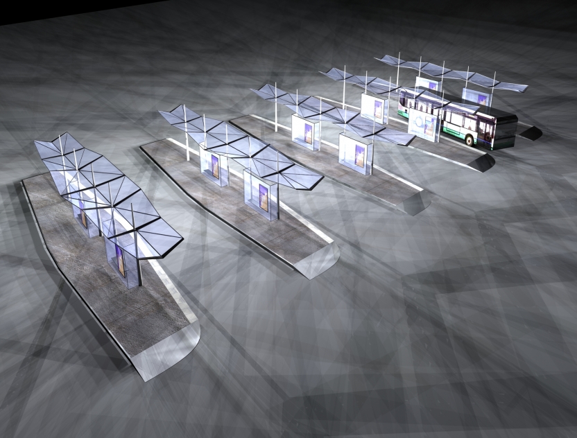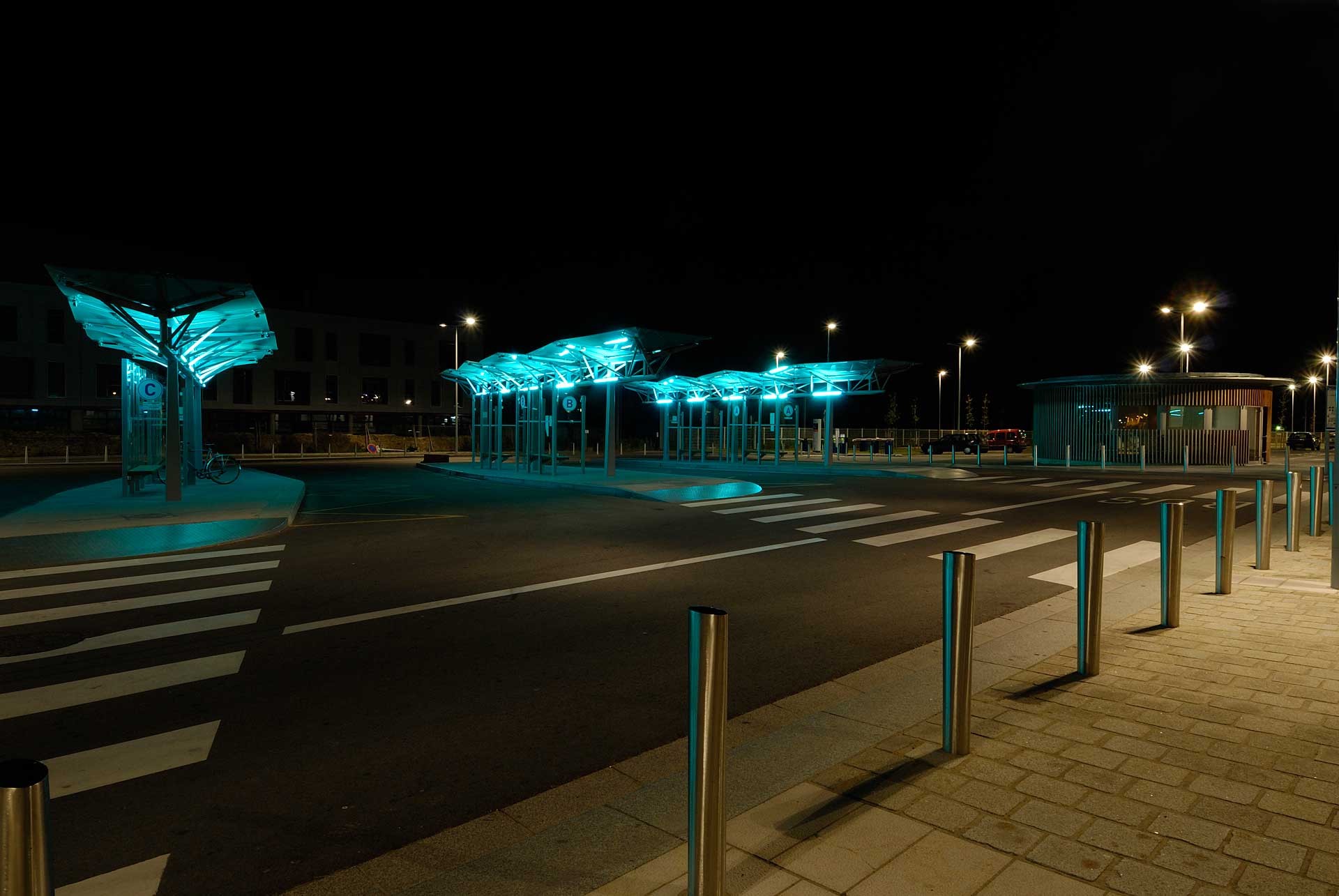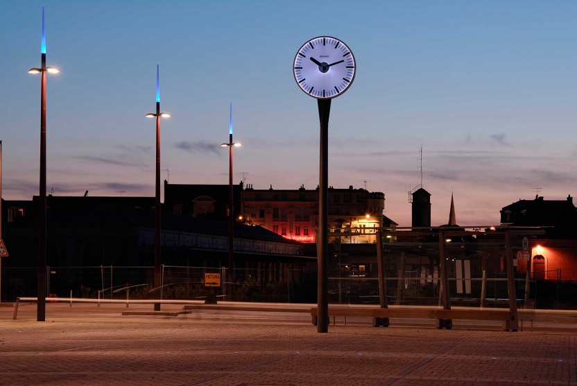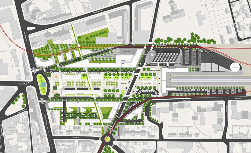 L’aménagement du parvis de la gare est placé sous le signe du voyage et de la mer. Le mobilier, le végétal, la lumière se décline selon ces thématiques ; les abribus évoquent des voiles gonflées prêtes à appareiller, les bancs des malles en bois, la végétation dans les massifs en creux est exotique, bien qu’acclimatée, et les passerelles qui traversent les massifs sont autant d’embarcadères.Les lumières du parvis dessinent un nouveau paysage le soir tombé, en écho avec la façade de la gare TGV.