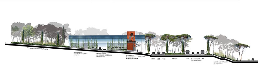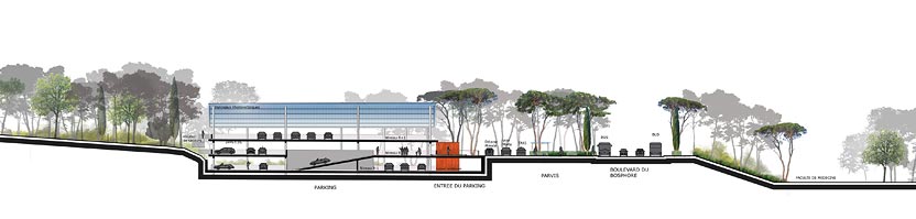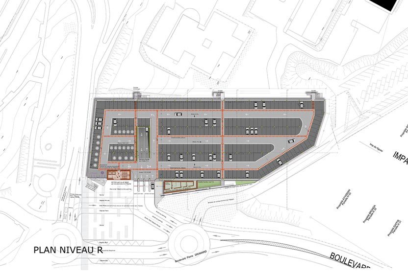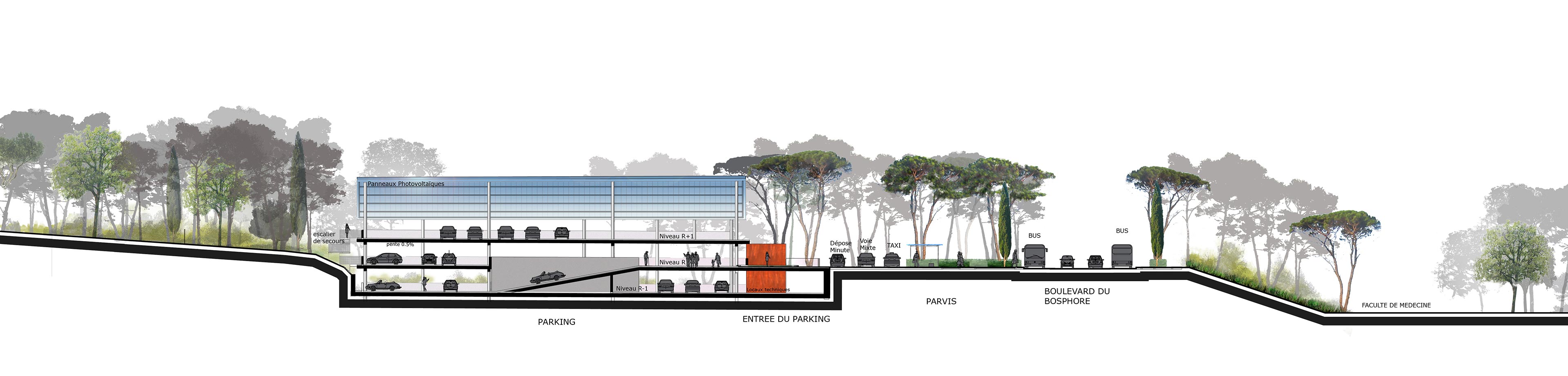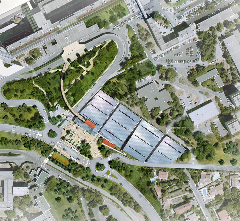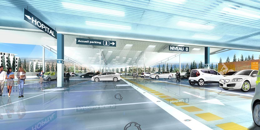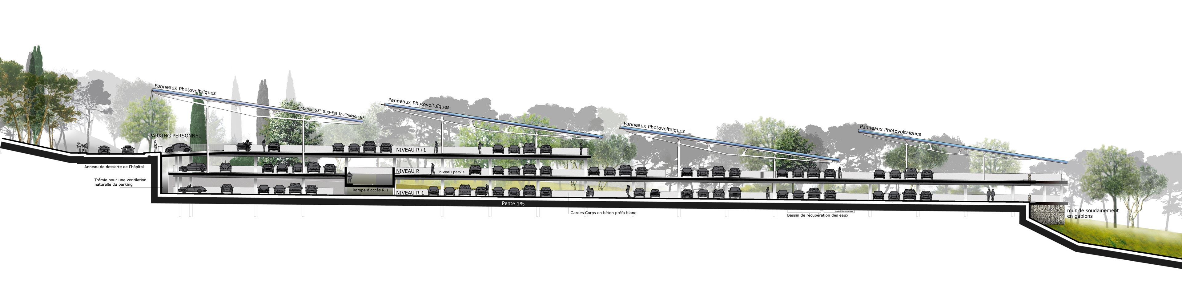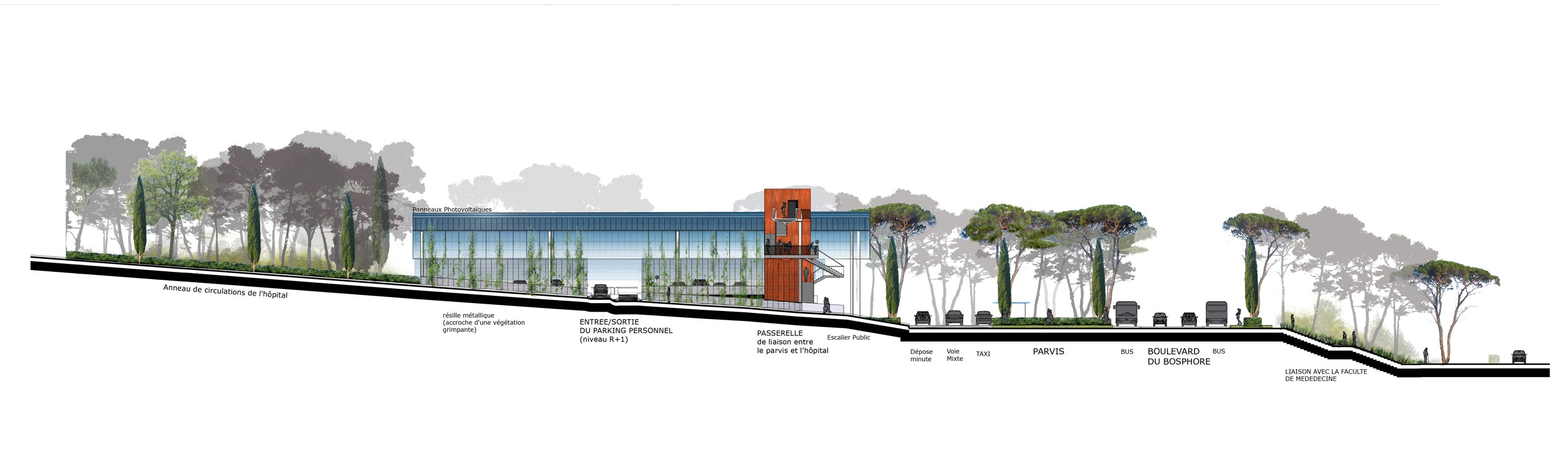 La construction s\\\\\\\'adapte finement au site et propose une grande couverture énergétique constituée de 4000 m2 de panneaux photovoltaïques, devenant ainsi une construction à énergie positive , tout en offrant une protection solaire optimum aux terrasses de stationnement. Ce projet offre plusieurs atout à l\\\\\\\'hôpital : une image d\\\\\\\'innovation environnemantale et architecturale tout en répondant aux besoins fonctionnels du site.il permet égelement une reconfiguration claire des accès tous modes.